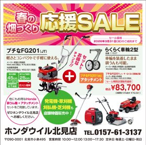 さて、ホンダウイル北見店では、『春の畑づくり応援SALE』を行っております。